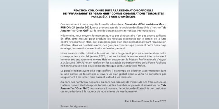 Cette décision, qui fait suite à une demande formelle adressée au Secrétaire d’Etat américain Marco Rubio le 24 janvier 2025, est considérée par les signataires comme une réponse directe à l’appel des forces politiques haïtiennes en faveur d’une action internationale contre les groupes criminels. Cependant, ils estiment que cette désignation ne pourra produire des résultats concrets que si elle est accompagnée d’un plan international plus large.